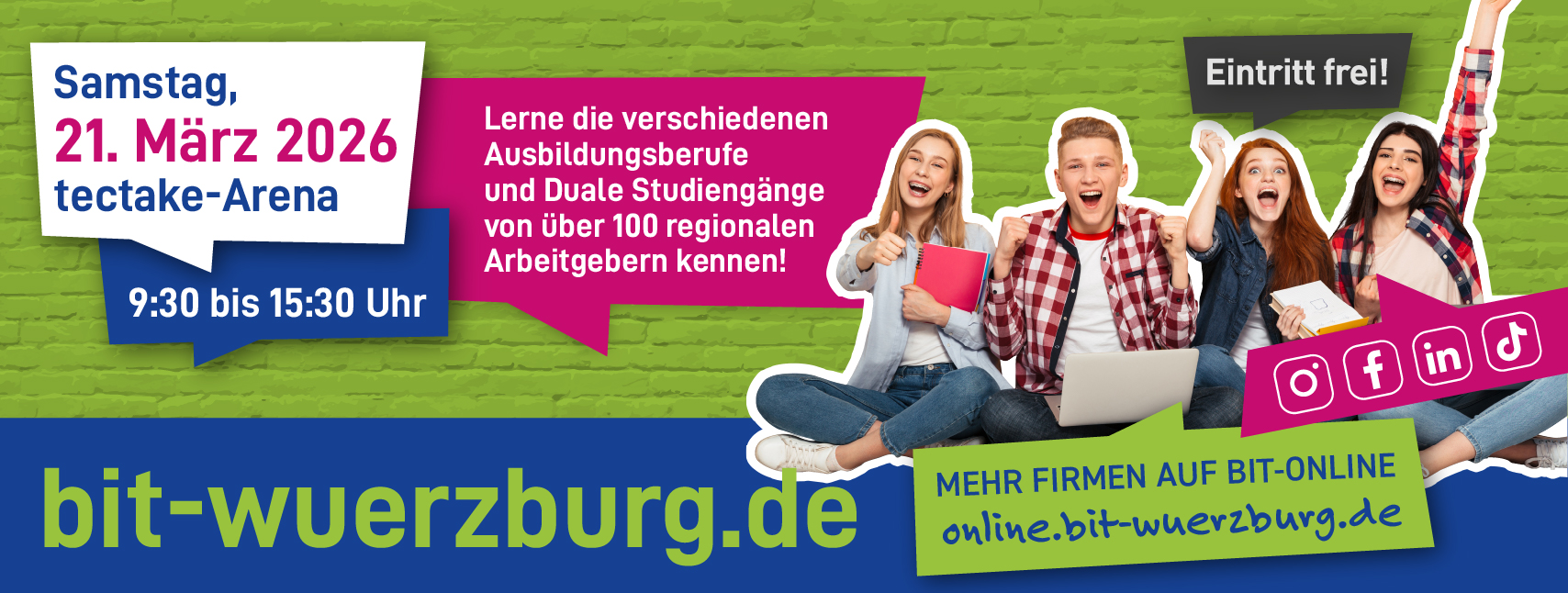 Der von den Wirtschaftsjunioren Würzburg veranstaltete Berufsinformationstag (BIT), findet 2026 wieder den Weg nach Würzburg. Über alle weiteren Themen halten wir auf unseren Kanälen und Websites auf dem Laufenden.